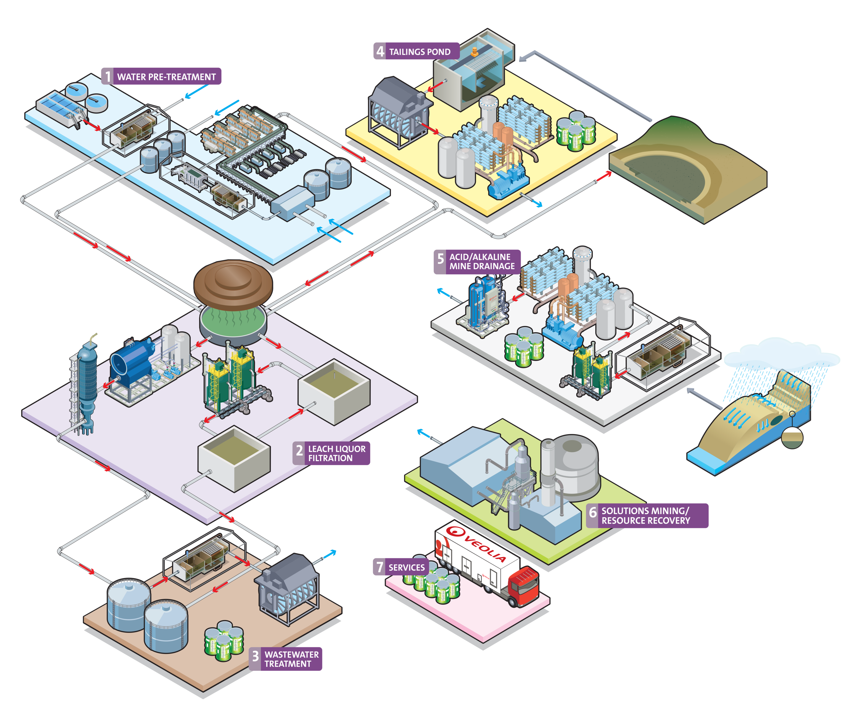 Veolia Water Technologies travaille avec des sociétés d'exploration, d'ingénierie et d'exploitations minières pour résoudre leurs problèmes d'eau minière, en partant de la production d'eau potable ou d'eau à dessaler (en sites éloignés) jusqu'au traitement des eaux de procédés et aux solutions en eaux usées pour tous les types de sites miniers tant souterraines que de surface ou encore l’extraction par injection.